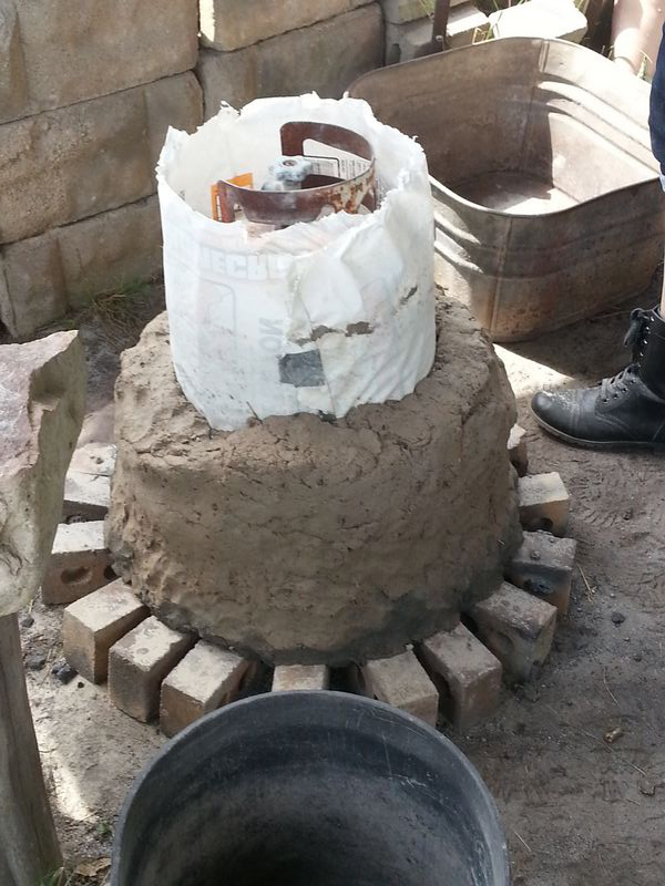| Here the tank has been raised by one step. At this point it is resting on a 50-50 belnd of coarse dry sand and dry wood ash. That mix will act to stabilize the construction and aid in the walls drying. Previous Text © Neil Peterson, 2017 Photographs © Neil Peterson, 2017 Copyright details Contact us | ||