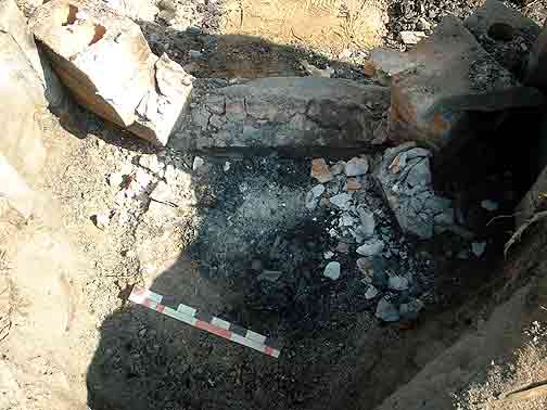 | The original packed earth base after the slag mass was removed. Although there was a little discolouration due to heat effects, this was surprisingly little and did not penetrate past the very surface. Previous Text © Darrell Markewitz, 2017 Photographs © Darrell Markewitz, 2017 Copyright details Contact us | ||