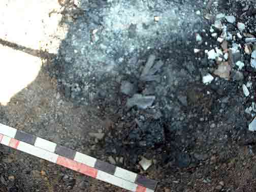 | Close up of the packed earth base. Strips of paper, carbonized but not consumed, remain from the material used to start the intital wood pre-heat fire Previous Text © Darrell Markewitz, 2017 Photographs © Darrell Markewitz, 2017 Copyright details Contact us | ||