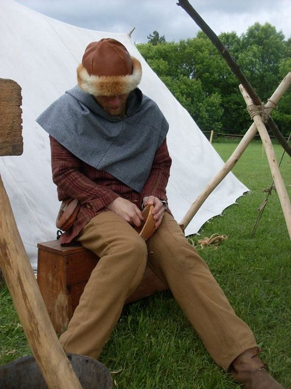 Þorgeirr working to finish the inside of a bowl by carving away the remaining pieces of wood.